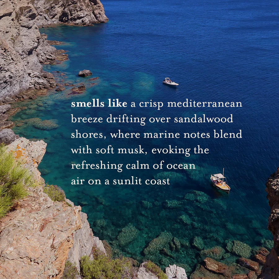 Smells like a crisp mediterranean breeze drifting over sandalwood shores, where marine notes blend with soft musk, evoking the refreshing calm of ocean air on a sunlit coast
